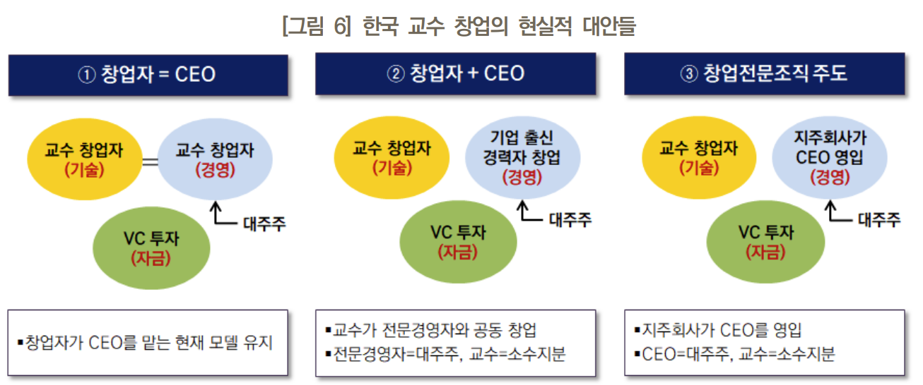 다만, 한국은 여러 가지 여건상 VC 주도 모델이 실현되기 어려운 점을 저자는 지적한다. 우선, 법률상 투자사의 경영지배 목적 투자가 제한되어 있고, 상장시 대주주의 지분이 20%가 넘어야 한다는 요건이 있다. 또한, 이사회 중심의 지배 구조가 정착이 되지 않고, 대주주인 창업자 위주의 경영이 이루어지는 기업 거버넌스를 가지고 있다. 추가적으로 한국 스타트업 생태계는 상대적으로 역사가 짧아, 전문 경영인의 인적 자원이 제한되는 한계도 있다. 이에 따라 저자는 교수가 창업을 계획하고 있는 경우 아래 그림[1]과 같은 대안을 제시한다. 1번은 현재 모델과 같고, 2번의 경우 기술을 가진 교수가 경영에 대한 경험이 있는 인원과 공동 창업을 하는 것이고, 3번의 경우 대학 기술지주회사와 같은 창업전문조직이 CEO풀을 확보하여, 학내 교수들과 창업의 전 과정을 주도하는 것이다.